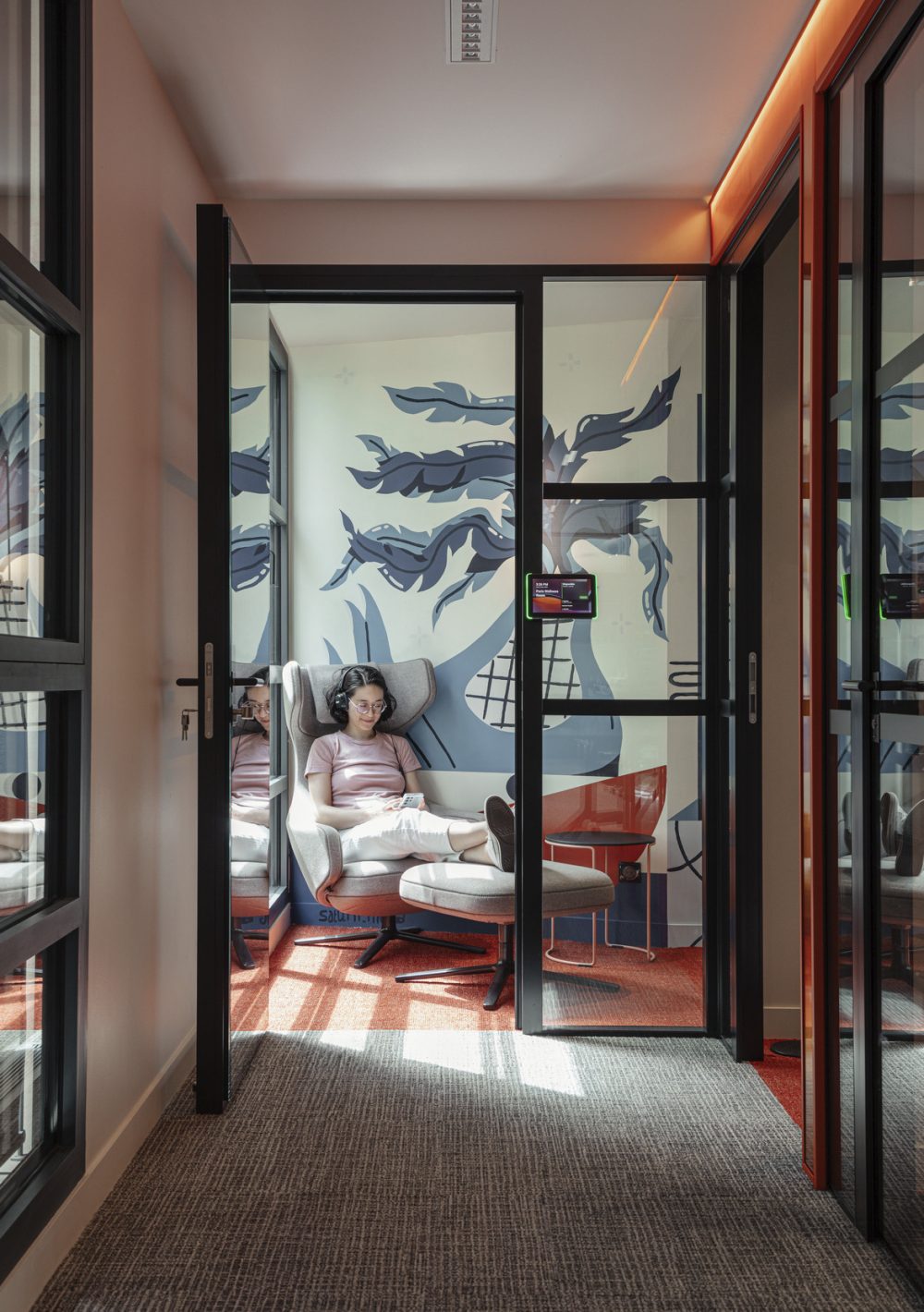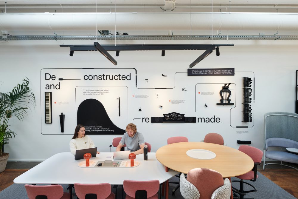 Amsterdam: This space demonstrates how technology can strengthen operational efficiency and support ambitious climate goals, an invisible partner for making better decisions about design. The teams’ approach continually aligns the space with M Moser’s needs, offering a responsive solution to modern building management. Originally restored in 1901, M Moser repurposed the building from its initial function as a concert hall — its rich musical heritage is reflected throughout the space as artistic installations like this deconstructed piano. This office has earned the WELL Building Standard – Platinum, and is targeting ISO 14064.