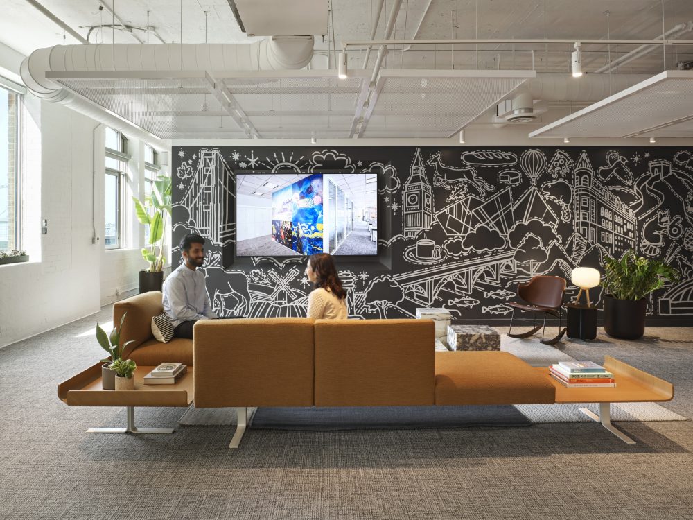 For example, the Paris team engaged a French illustrator, Saturn, to create a bespoke mural in their wellness room while the Vancouver brand experience team created an anamorphic graphic at the entry. It’s inspired by ‘perspectives’ and forms the word ‘create’ from a single viewing point. An isometric illustration celebrates their work and showcases various project types on a large TV wall. An animated, digital portion of this illustration continues across the large TV.