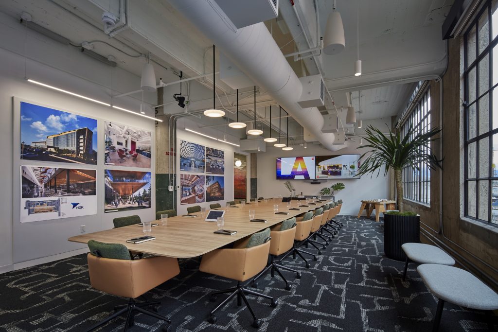The design of HOK’s Los Angeles studio illustrates a narrative of community integration, sustainability, and employee-centric innovation. Located in the dynamic Arts District, the studio embodies HOK’s core values of inclusivity and environmental stewardship. By embracing unassigned workspaces and adaptable environments that cater to neurodiverse needs, HOK has created a flexible, inclusive atmosphere that sets a new standard for modern workspaces. The use of biophilic design principles, abundant natural light, and materials selected for low environmental impact all contribute to a harmonious and health-conscious space that reflects HOK’s dedication to employee well-being.
