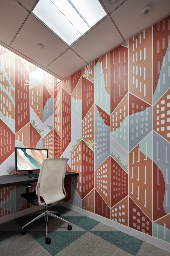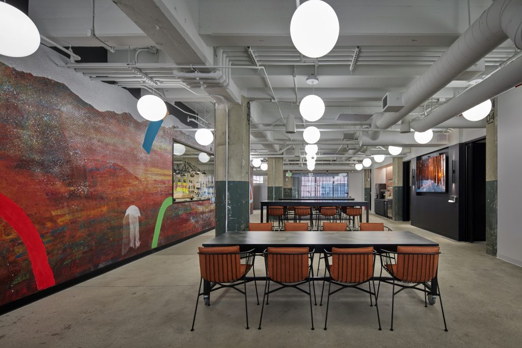 Branding elements showcase local culture. The team worked with art consultant Tre Borden & Co. to source proposals from local artists, ultimately commissioning a custom mural and curating a collection of rotation pieces to be featured in the Reception. For example, Adee Roberson’s vibrant mural that celebrates the nearby San Gabriel Mountains, and a rotating art collection that brings dynamic visual storytelling into the workspace, supporting creativity and connection.