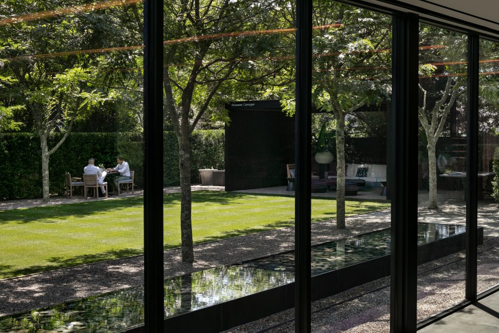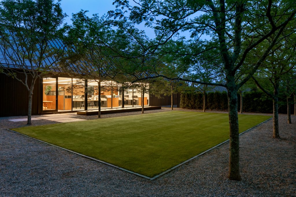 Having spent decades designing landscapes for homes in the Hamptons, Chris LaGuardia enjoyed the privilege of choosing some of his favorite collaborators, now professional and personal friends, to design his office. Accordingly he asked Viola Rouhani of Stelle Lomont Rouhani Architects to design the building. He asked David Scott, interior designer, to design the interiors, and he asked Nathan Orsman to design the lighting. Richard Dunphy, was the general contractor, the sculptures in the office were done by artist Dick Shanley, and the paintings in the office were done by Paton Miller.