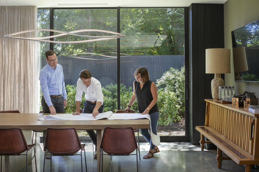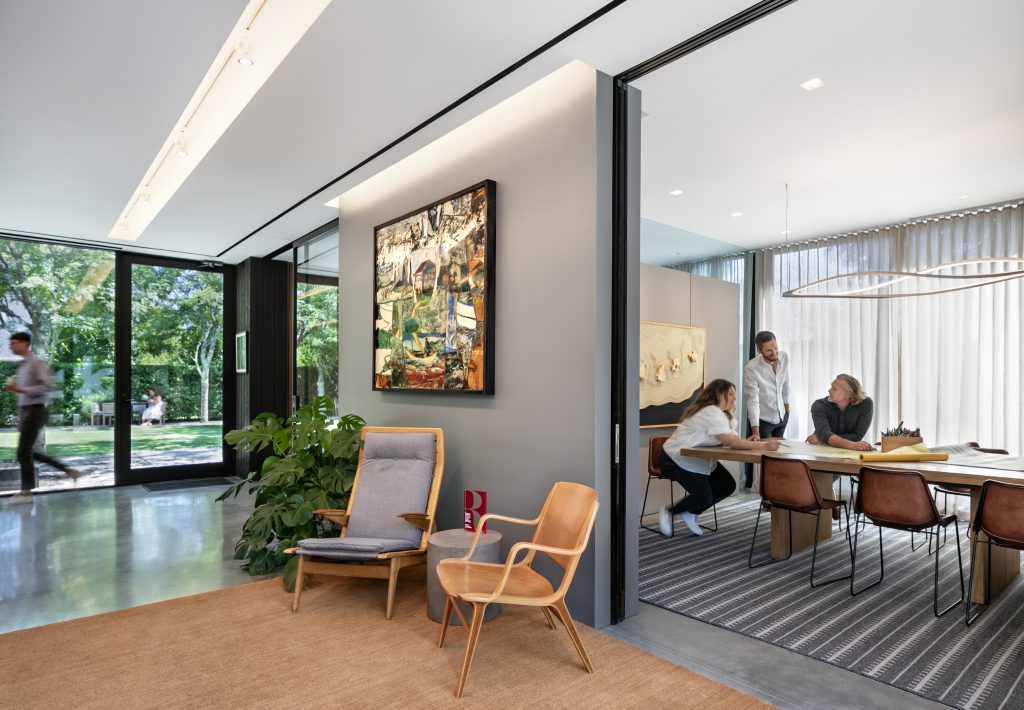 There have been several post-occupancy benefits. One is that when clients visit the office, its residential scale, sophisticated design and overall feeling often prompt a response of “We want our house to feel like this.” For the same reasons, virtually everyone loves coming to the office five days a week. Only a couple of people use remote work days. The large open plan lends itself to collaboration and camaraderie, as does sitting at the custom 40” x 18’ work table that enables everyone to gather to have lunch together or to assemble for lectures and presentations. Feedback from employees has been very positive. Unsurprisingly the garden is a popular space for lunch and office events and the parking lot doubles as a pickleball court.