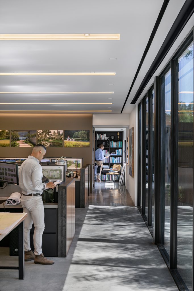 The architecture, interior design and landscape design coalesce in the rear wall of the building, which is entirely floor-to-ceiling windows and glass doors. Bringing the outside in is a major design gesture of this office, appropriate for landscape architects and playing an essential role in bringing light and air into the workplace.