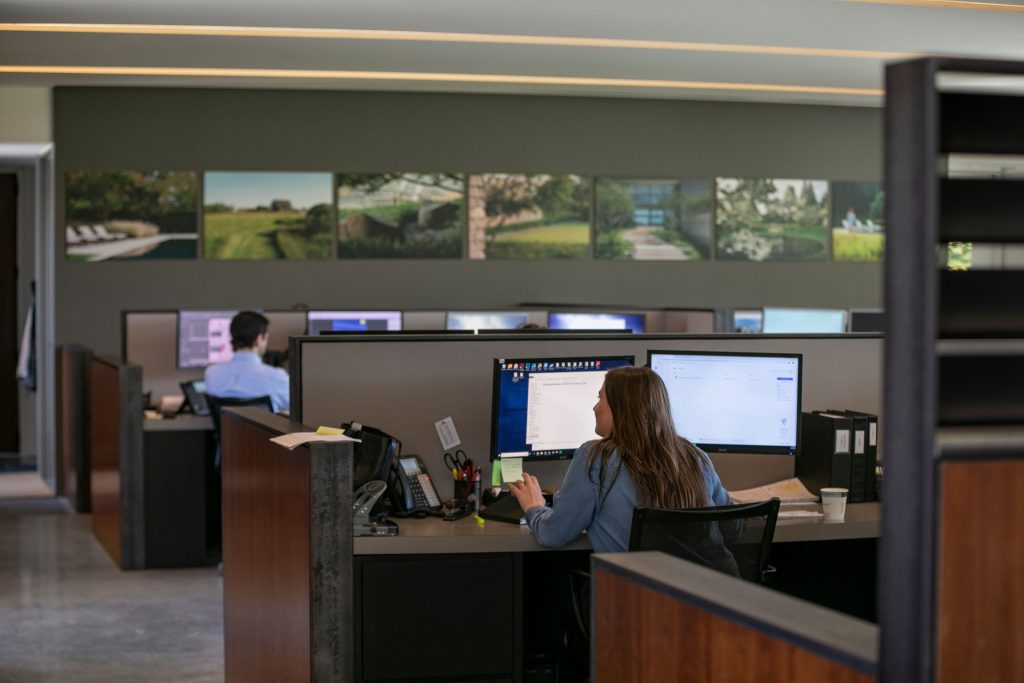 This office was designed for (and with) its owners, landscape architects LaGuardia Design Group, so leadership – especially Chris LaGuardia – was intimately involved in its planning. As modernists, they wanted a clean-line, elegant interior. As landscape architects, the outside space and landscape were of primary importance; when weather permits, the staff spends a lot of time outside.