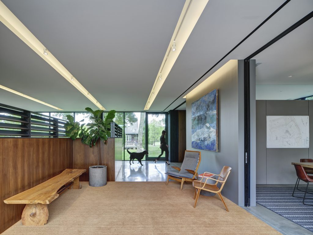 Being in a semi-rural environment allows employees to be outside often; the large gesture of including a large backyard, as noted, gives everyone access to the outdoors all the time. Principles of biophilia suggest that even looking through the rear window wall to the grass and trees outdoors, being able to see the wind and weather, and allowing abundant sunshine in all contribute to a sense of wellbeing, higher productivity and wellness. In fact employees can easily walk to the main street of Water Mill for lunch at local restaurants or for take-out.