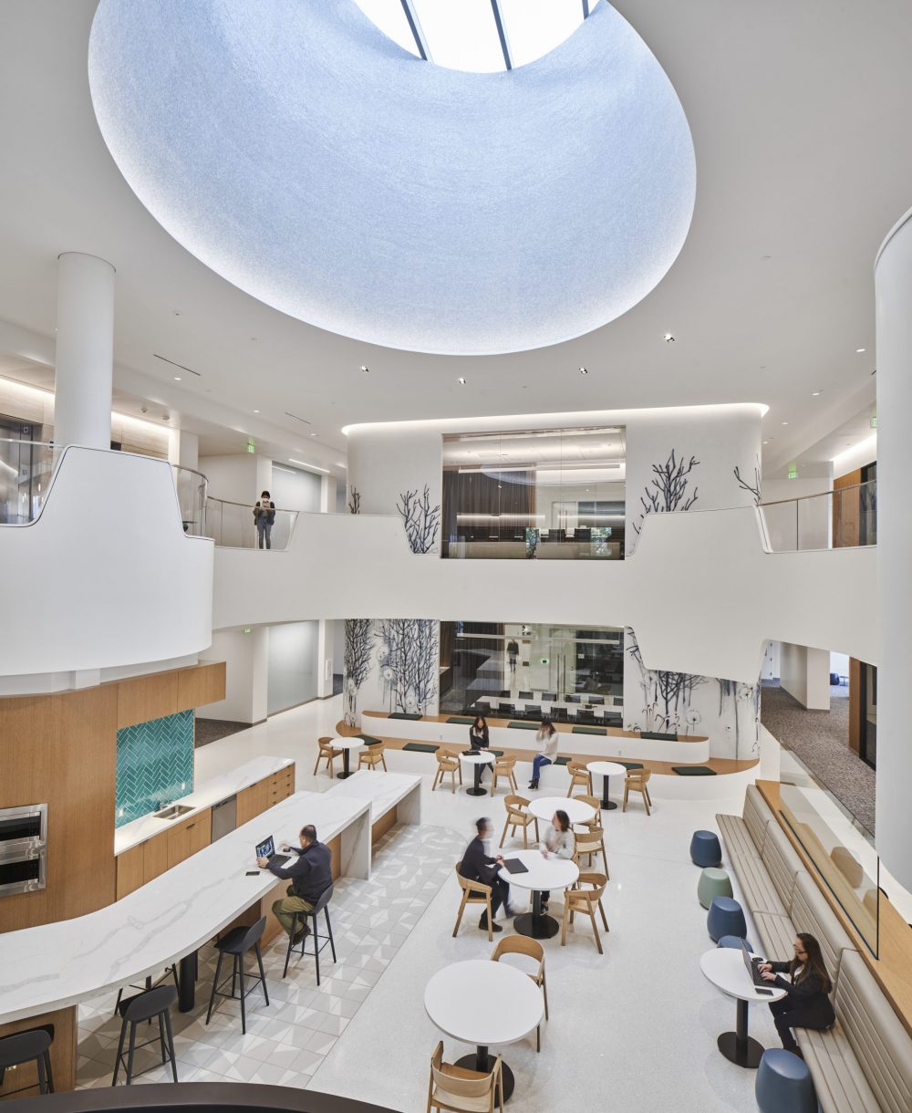 Once this low frequency baseline to stimulate and direct attention and joy is established, design can move toward delight. Just as a sudden meadow or waterfall surprises and uplifts, certain spaces can be designed as social destinations—places that energize and inspire. In these areas, stimuli can be amplified by color variances, bolder juxtapositions of materials, dynamic acoustics and playful textures that create a sense of vibrancy and engagement. Food spaces, team zones, large meeting rooms and in between spaces are ideal for this kind of design, supporting social interaction and creative energy.