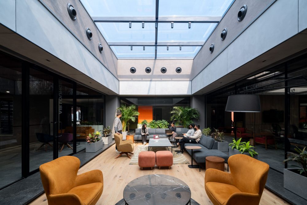 Sky: Large curtain walls and high windows bring in natural light and offer wide views of the outdoors. Skylights flood the interiors with daylight, reducing the need for artificial lighting. Access to bright natural light and views of the sky boost mood, comfort, and productivity.