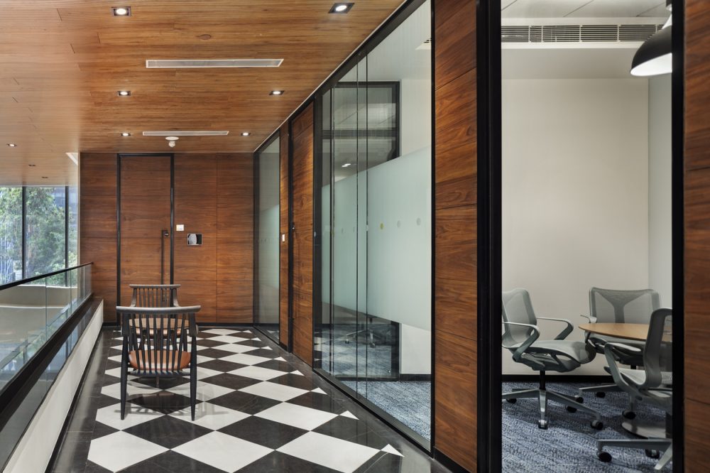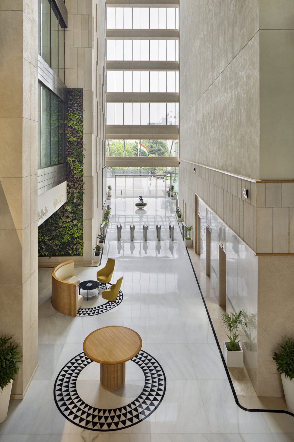Green walls are strategically planned in the atrium to improve the microclimate and introduce a calming natural element, while glazing on the eighth floor maximises daylight and reduces reliance on artificial lighting. Materials such as locally sourced Gwalior sandstone, recyclable zinc cladding on walls, and carbonised bamboo panels are chosen to connect the design to its regional context while prioritising sustainability. Low-flow water fixtures are installed in all restrooms to reduce water consumption. Carpets made from recycled materials further reinforce a commitment to circularity.