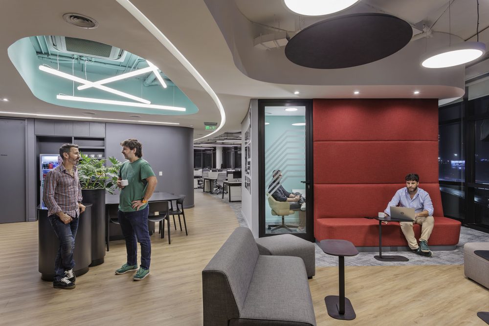 Furniture selection was essential for both functionality and aesthetics, with pieces by Interieur Forma, Crotti, Giuliani, and Fauna. Acoustic comfort—especially in phone booths and focus areas—was addressed with custom solutions from Ruido Blanco. Lighting, supplied by Indigo Lumieres, was designed to create flexible and pleasant environments throughout the workspace. Technical elements were supported by Atlantis, who developed custom welded architectural details.