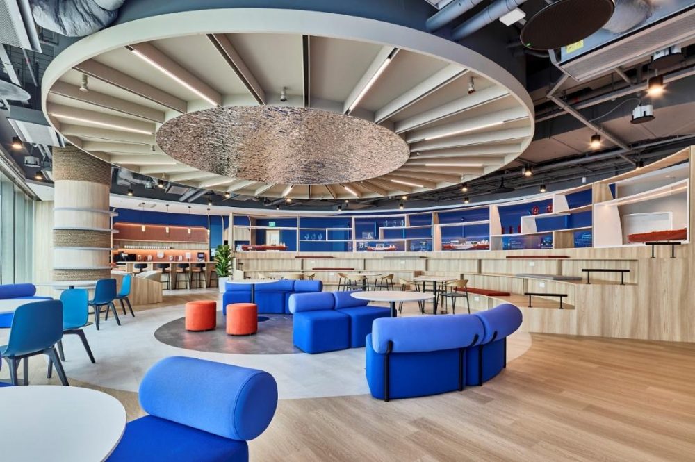 Inspired by the maritime industry’s connection to the sea, the design incorporates flowing curves and wave-like forms. Open and flexible social zones embody the ‘Ripple’ effect, fostering spontaneous interaction, while dynamic meeting rooms and immersive reception areas reflect the ‘Whirl’ that encourages deeper dialogues. A blue carpet trail, textured like ocean currents, subtly guides users through the ergonomic workstations that support a ‘Flow’ into focus. Nautical details—such as anchor rope-textured finishes, propeller-inspired ceiling features, reflective ripple panels, rustic deck lights, and tanker-like structures—transform the workplace into an immersive, on-ship environment. These elements seamlessly blend functionality with a distinctive expression of brand identity.