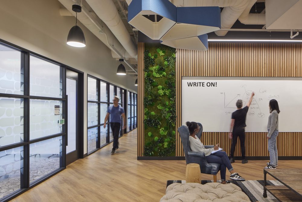 When employees and visitors step into the new workplace, the environment activates them with a welcoming atmosphere and streaming music. A concierge conveys the feeling of experiencing an exclusive club. The workplace experience connects people — both employees and guests — to the Gen brand, while also conveying a sense of importance.