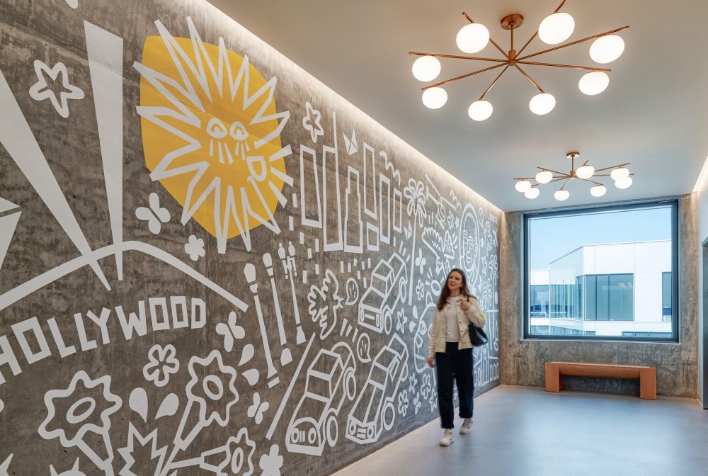 Upstairs, scaffolding-like trim around the conference room doorways references the iconic Hollywood sign visible out the windows. EDELMAN is spelled out in abstract letters backward, mimicking the sign’s construction from behind. Furnishings include an eclectic mix of new and reclaimed pieces, with warm lighting and walnut shelving enhancing the retro vibe. The project combines hospitality and workplace design thoughtfully, balancing the features and branding with the functionality of each floor.