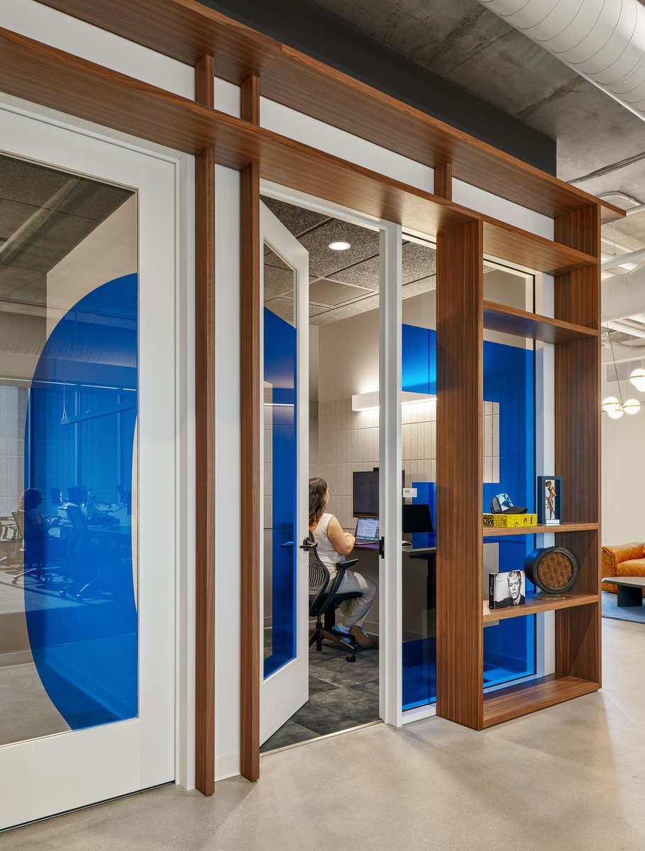 Upstairs, the workspace area was designed to fulfill all the needs of a modern media agency. There are free-address desks for hybrid staff to use daily, meeting rooms, a casual lounge area, and numerous single occupancy phone rooms—a necessity at the buzzing communications firm, providing a quiet space for calls with appropriate lighting and acoustics for video.