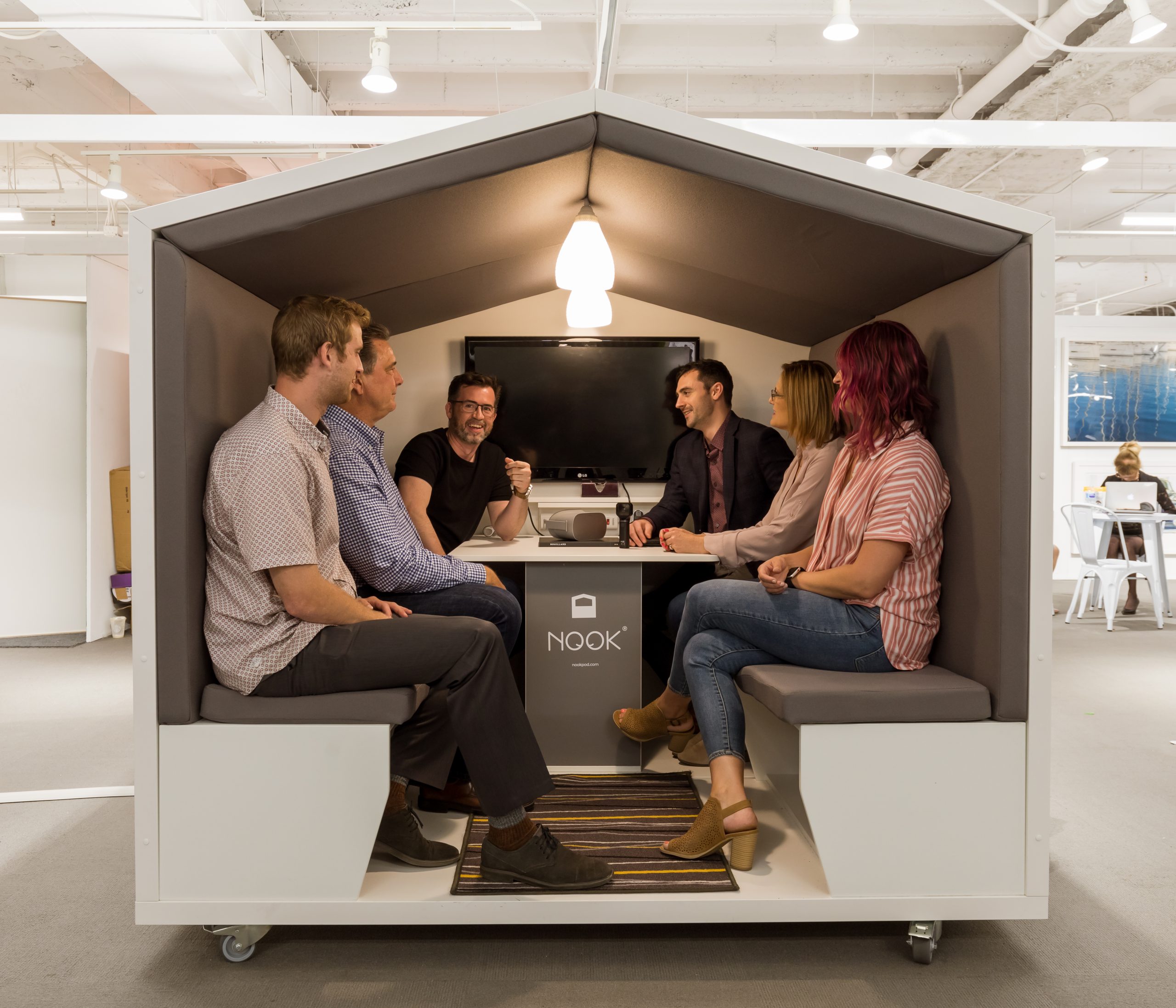 Designed to maximize people density and personal safety, Nook Huddle and Open spaces, Solo booths and accessories are mobile, modular and building code friendly.