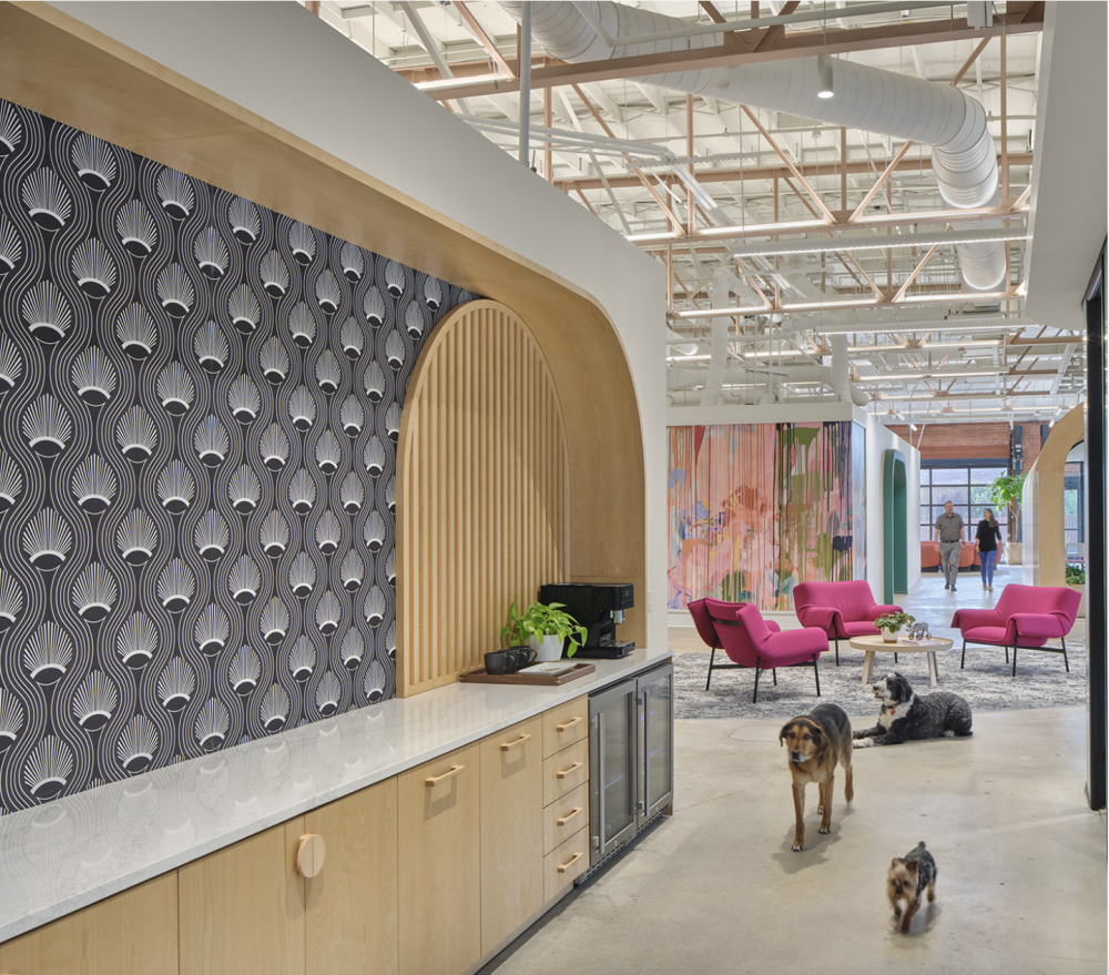 At the heart of the concept is The Leash, a fluid pink design element that winds through floors, walls, and ceilings, physically and metaphorically linking work zones, gathering spaces, art installations, and the outdoor garden. It symbolizes connection, freedom, and the firm’s pet-friendly culture.