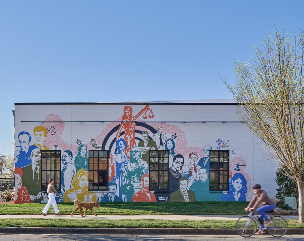 Art plays a pivotal role in storytelling. The street-facing mural features iconic real and fictional attorneys, including Ruth Bader Ginsburg, Abraham Lincoln, and the firm’s founders, offering a vibrant, approachable public face. Inside, a collaborative arts workshop produced a multidimensional mixed-media mural that reflects the culture of creativity and connection.