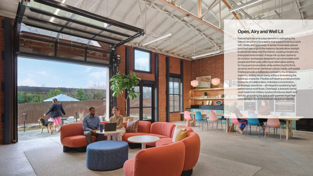 Original concrete floors, exposed steel trusses, and historic brickwork were preserved to honor the building’s history. Strategic window openings and roll-up garage doors flood the interiors with daylight, while flexible office “bands” stop short of the ceiling to maintain openness and visual connection to original architectural features. Well-being is embedded in every detail: height-adjustable desks, biophilic planting, photometric lighting, showers, bike storage, EV charging, and a dedicated wellness room. Outdoor areas are equally intentional, featuring a raised-seating garden, community table, herb plantings, and a bubbling rock dog fountain.