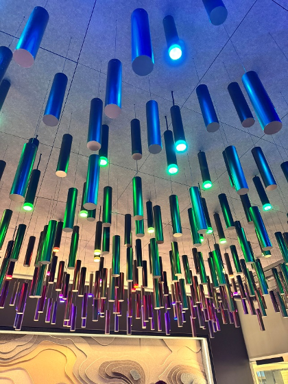 Equally memorable was Arktura’s award-winning showroom, which earned NeoCon Gold for its new RGBW integrated backlighting system. Conceived as an immersive lighting and acoustic environment, the space was shrouded in perforated panels across walls and ceilings, eliminating ambient distractions and focusing attention inward. The RGBW system cycled fluidly through a full chromatic range—pulsing, shifting, and glowing in rhythm with a live acoustic guitar performance. The effect was dynamic and atmospheric, transforming lighting from a static background element into a responsive, adaptable design tool. Arktura’s installation not only showcased technical sophistication but also illustrated how lighting can shape emotional resonance within a space.